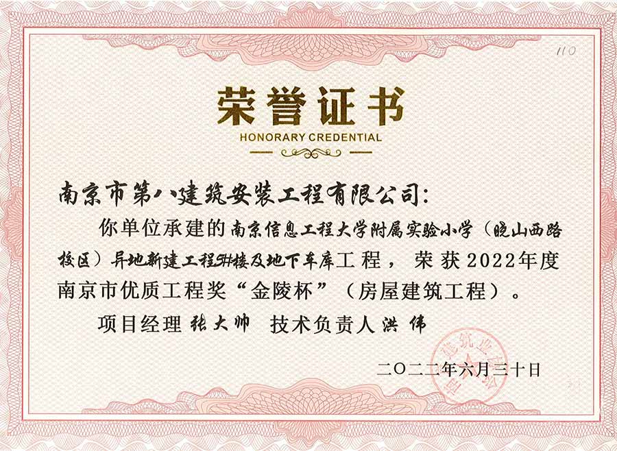 6月30日,南京建協(xié)下發(fā)了(2022)24號(hào)文件《關(guān)于公布2022年南京市優(yōu)質(zhì)工程獎(jiǎng)“金陵杯”(房屋建筑類、軌道交通工程)項(xiàng)目名單的通知》,決定授予“幸莊人才公寓”等208個(gè)項(xiàng)目為2022年南京市優(yōu)質(zhì)工程獎(jiǎng)“金陵杯”,我公司承建的13個(gè)項(xiàng)目榮獲榮譽(yù)。